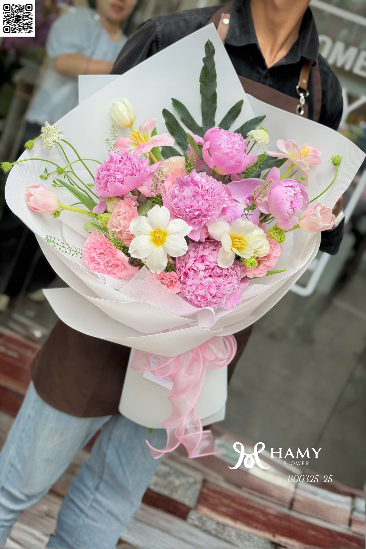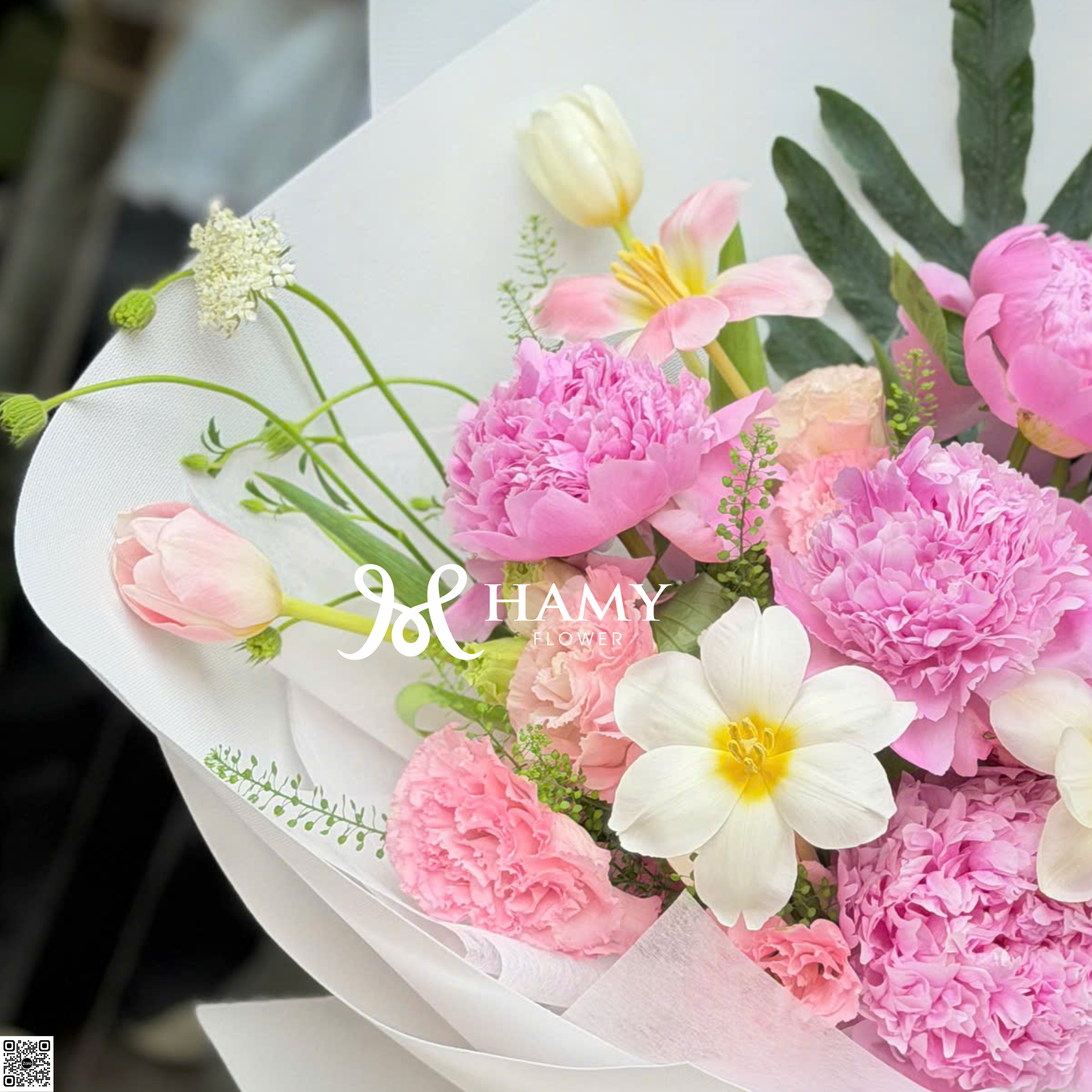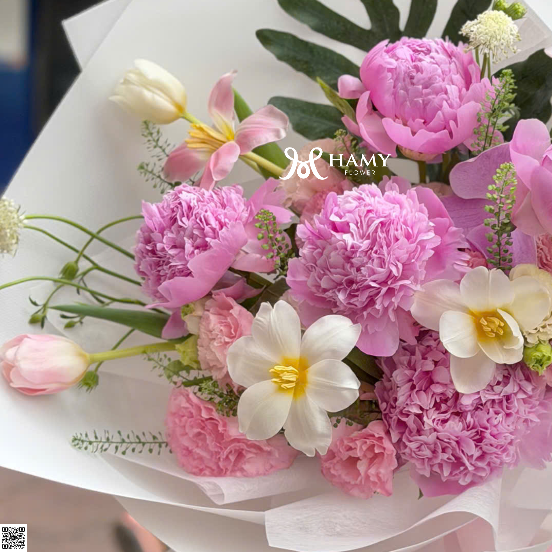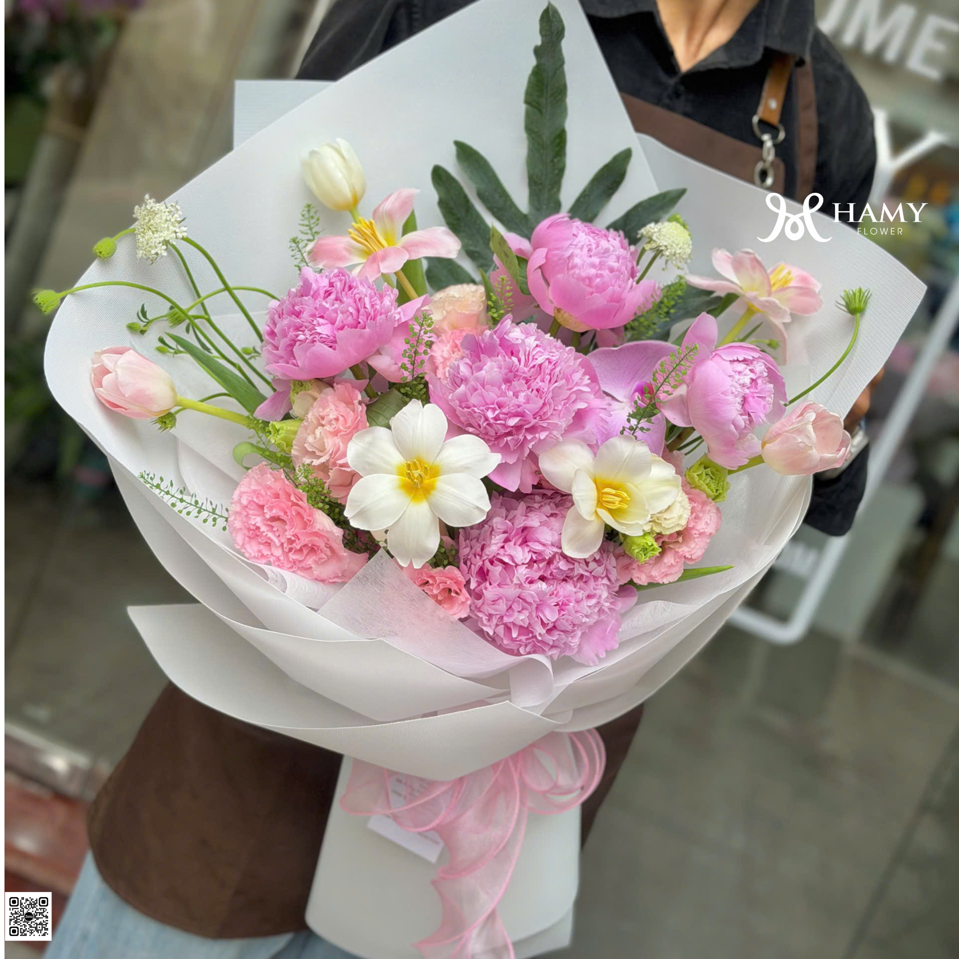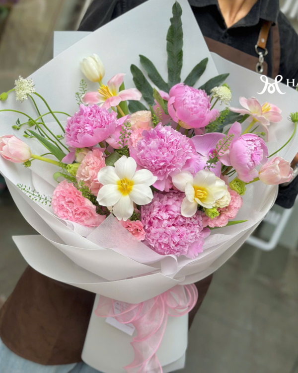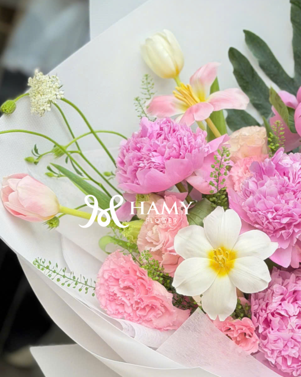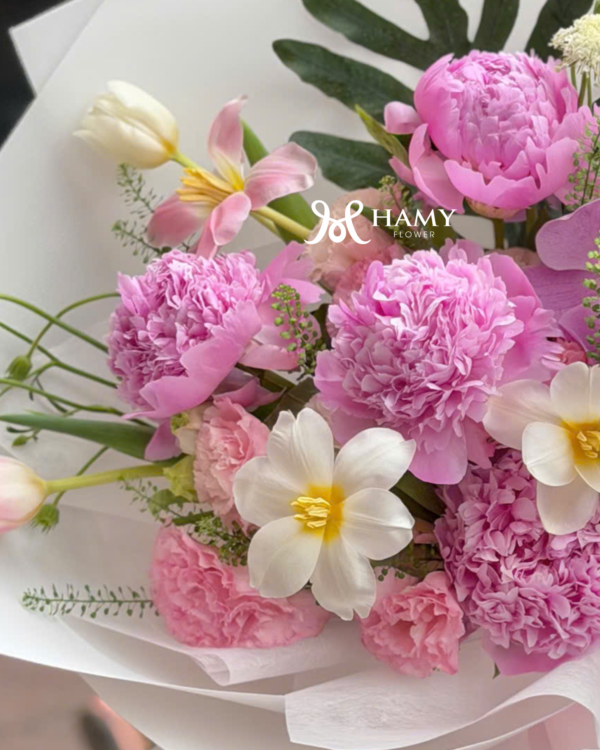 Khám phá mẫu bó hoa mẫu đơn Sara hồng cao cấp phối cùng Tulip nhập khẩu. Thiết kế sang trọng, tinh tế cho dịp sinh nhật, kỷ niệm. Đặt hoa ngay tại Hamy Flower Hà Nội.