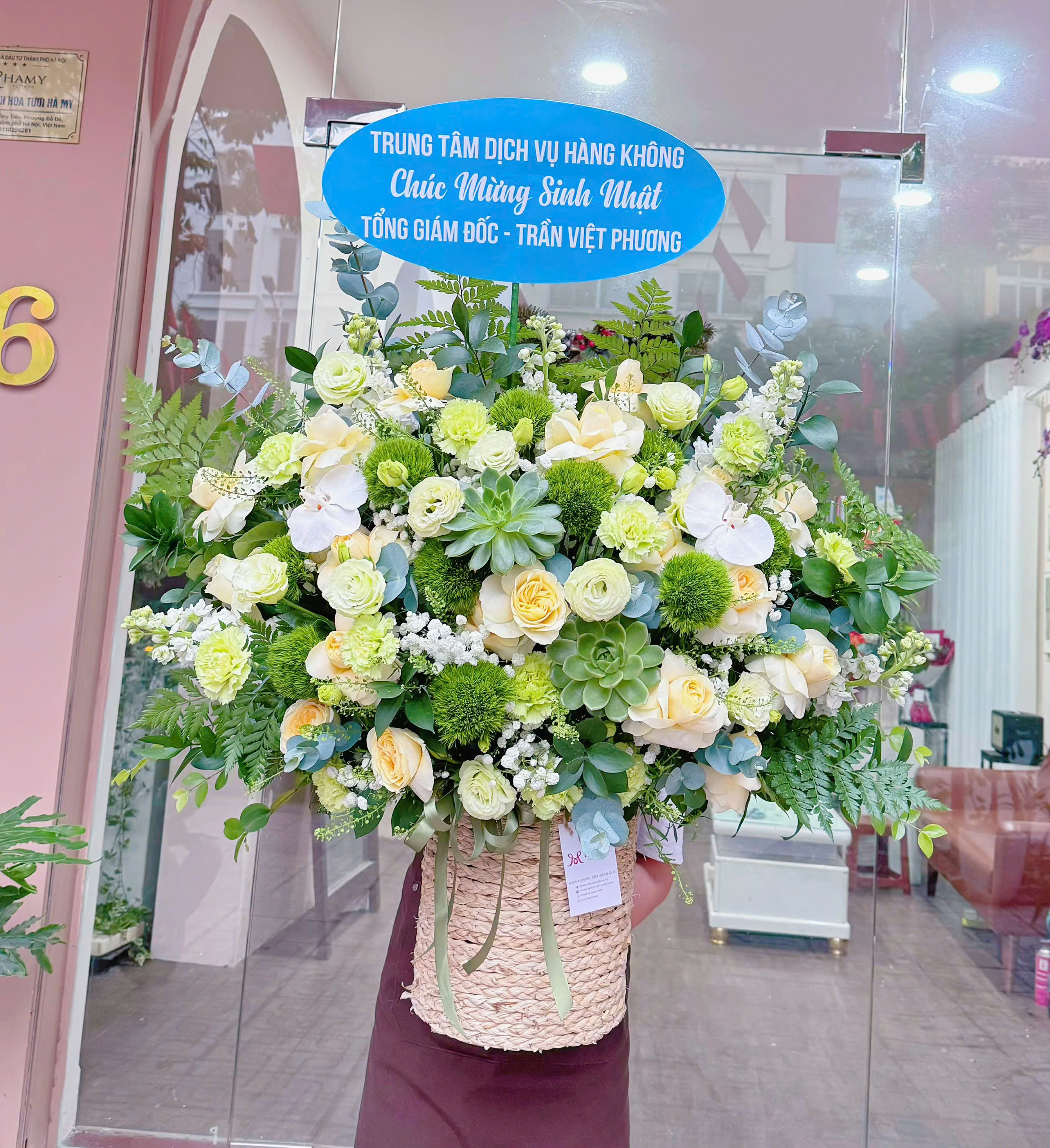 Sự kết hợp hài hòa giữa sắc xanh tươi mát và tông sáng nhẹ nhàng mang đến cảm giác dễ chịu, sang trọng và rất phù hợp với không gian trang nghiêm như văn phòng, sảnh lớn hay sự kiện quan trọng. Giỏ mây cao cấp cùng phong cách cắm tự nhiên giúp tổng thể vừa gần gũi vừa chuyên nghiệp.