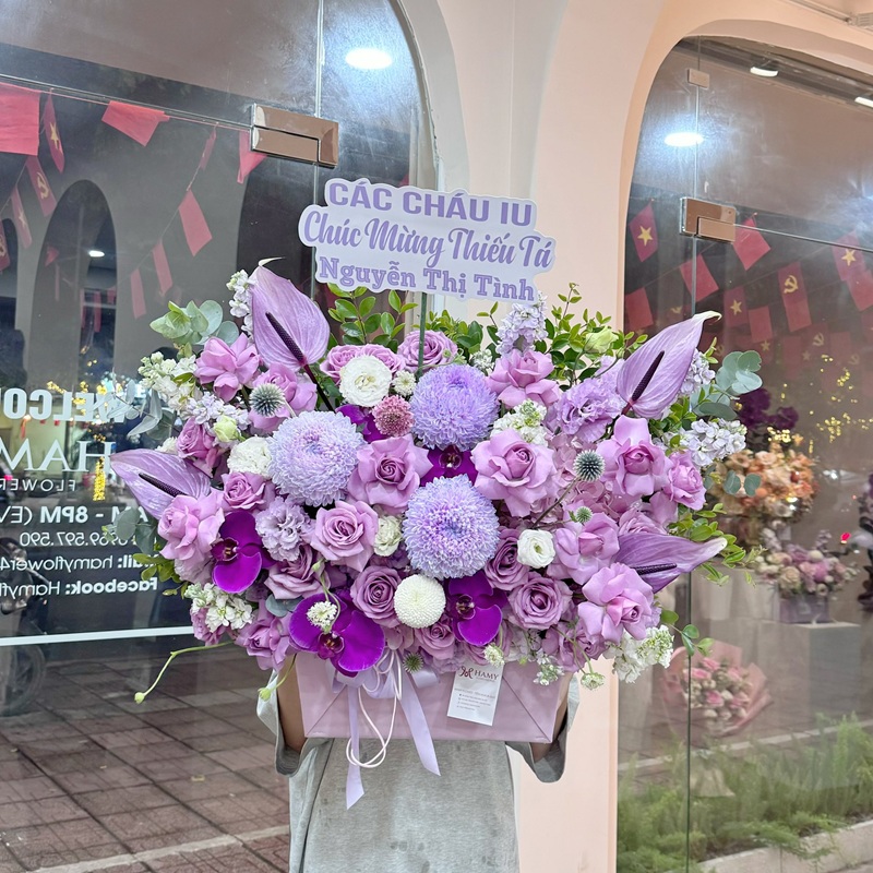 Lẵng hoa của Hamy Flower với bố cục hài hòa cùng gam màu nổi bật, lẵng hoa này mang đến nguồn năng lượng tích cực, phù hợp cho nhiều dịp quan trọng, món quà chúc thành công chân thành nhất cho người bạn quan tâm.