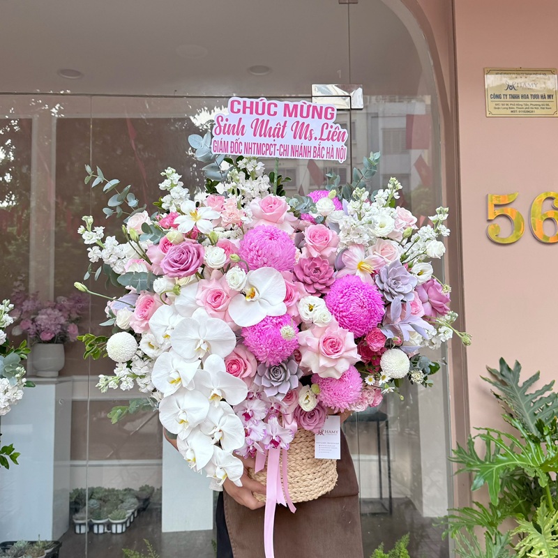 Lẵng hoa của Hamy Flower với bố cục hài hòa cùng gam màu nổi bật, lẵng hoa này mang đến nguồn năng lượng tích cực, phù hợp cho nhiều dịp quan trọng, món quà chúc thành công chân thành nhất cho người bạn quan tâm.